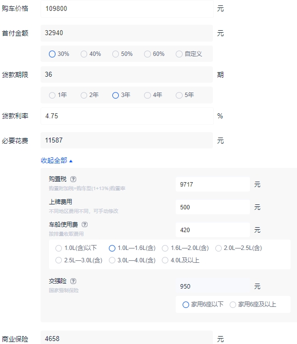 观致7的入门车型最低报价为10.98万元,分期购车的话,需要首付4.91万元,具体包括了原价30%(32940)+必要花费(11587)+商业保险(4658),一般分期年限为3年,每月月供5760元,购车总花费13.18万元,比去全款多花了5760元。